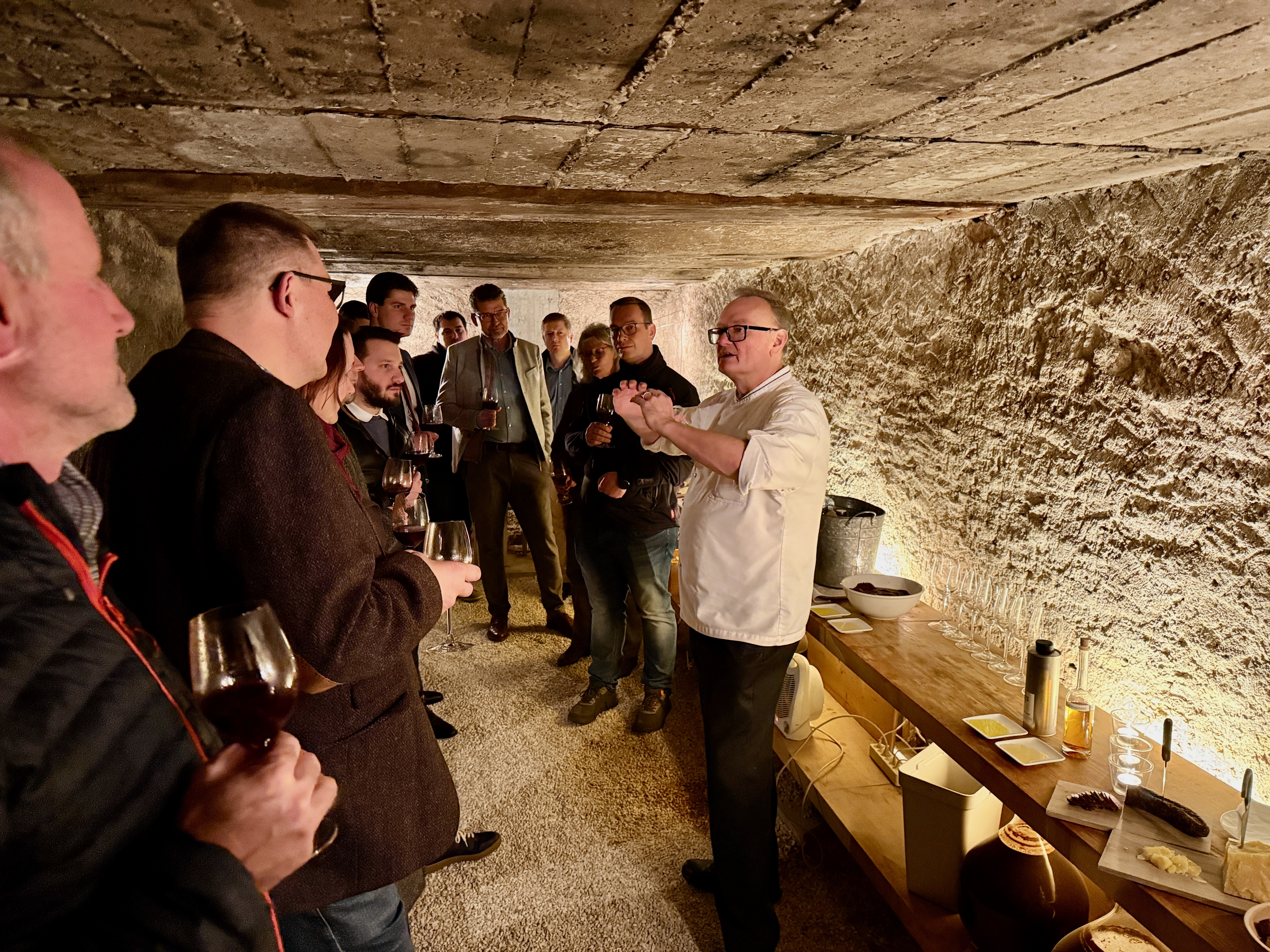 Nach einem kühlen Weissweinapéro stiegen wir in die Katakomben des Gasthofes hinunter. Dort vermittelte uns der Wirt Albi von Felten in einer witzigen und unterhaltsamen Weise die Geschichte, die Herstellung und den Variantenreichtum von Essig. Die Degustation von Balsamessig überraschte mit seinem fruchtigen Aroma. Dazu 40-monatiger Alpen-Sbrinz, hauseigenes Brot in goldenem Rapsöl getunkt und Lammsalami mit Baumnüssen verfeinert - einfach herrlich!