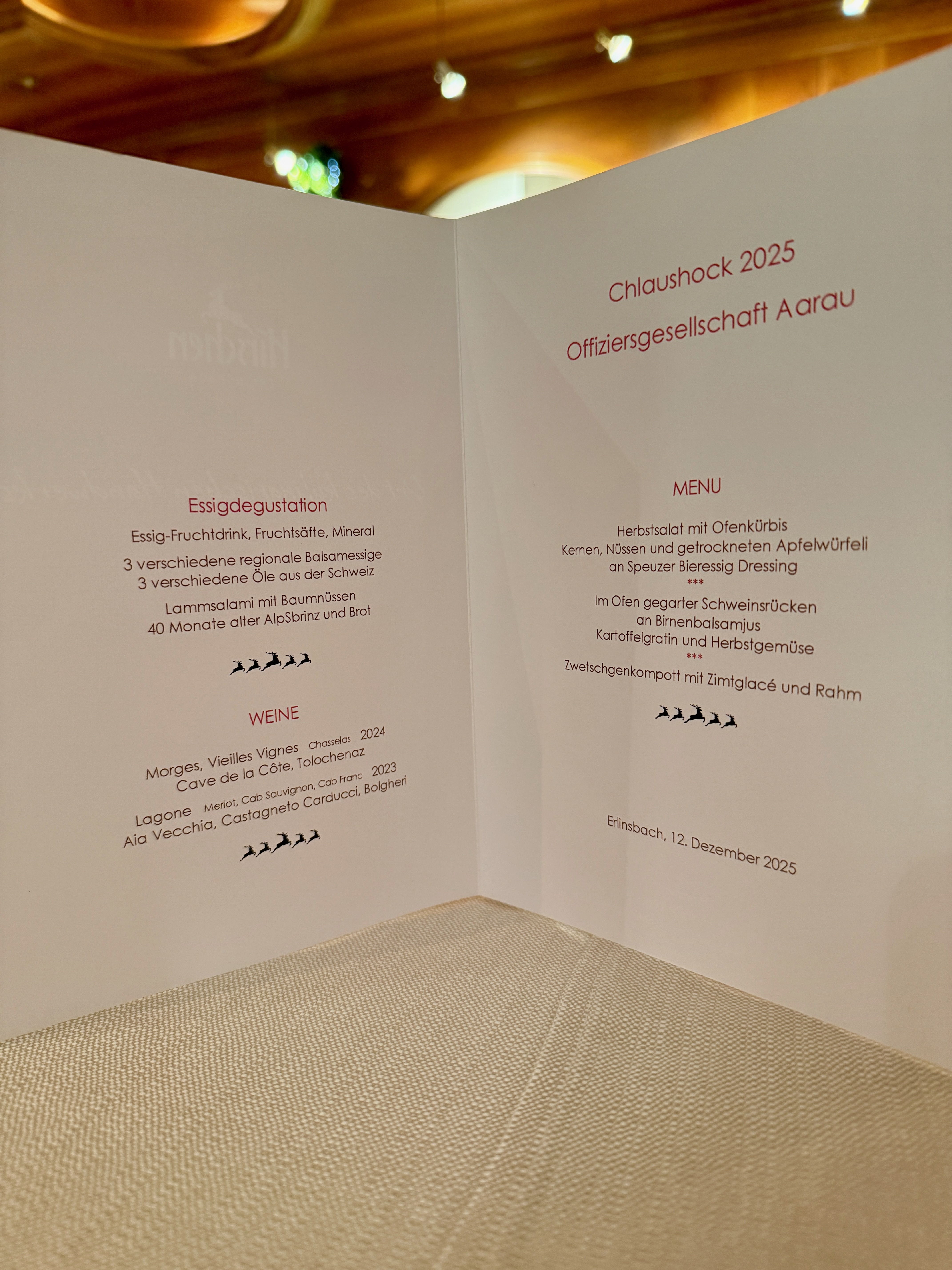 Chlaushock mit Essig-DegustationZum diesjährigen Chlaushock trafen wir uns im Landhotel Hirschen in Erlinsbach. Einmal mehr durften wir im Kreis der Offiziere zum Abschluss des Jahres einen grossartigen Abend verbringen.