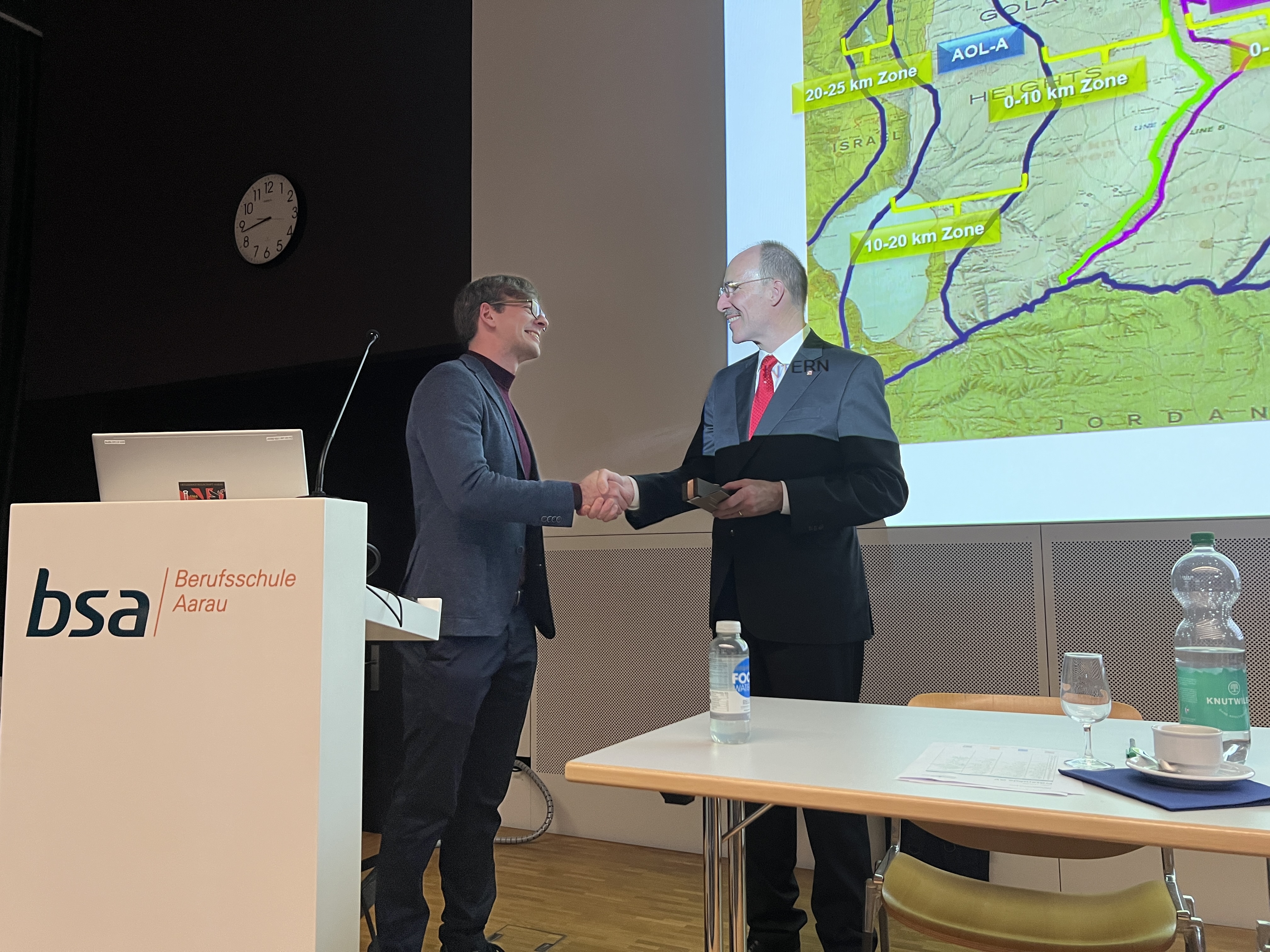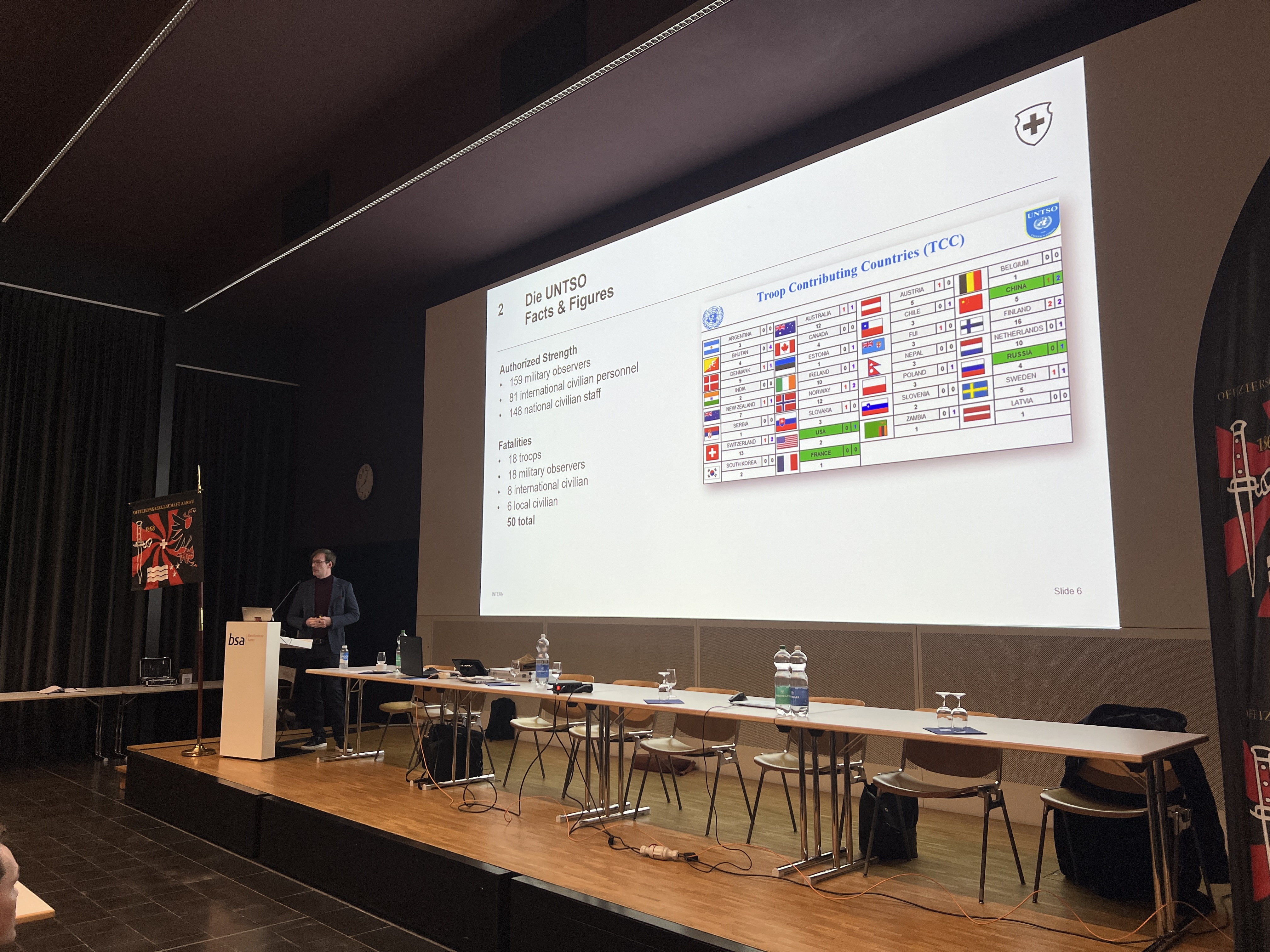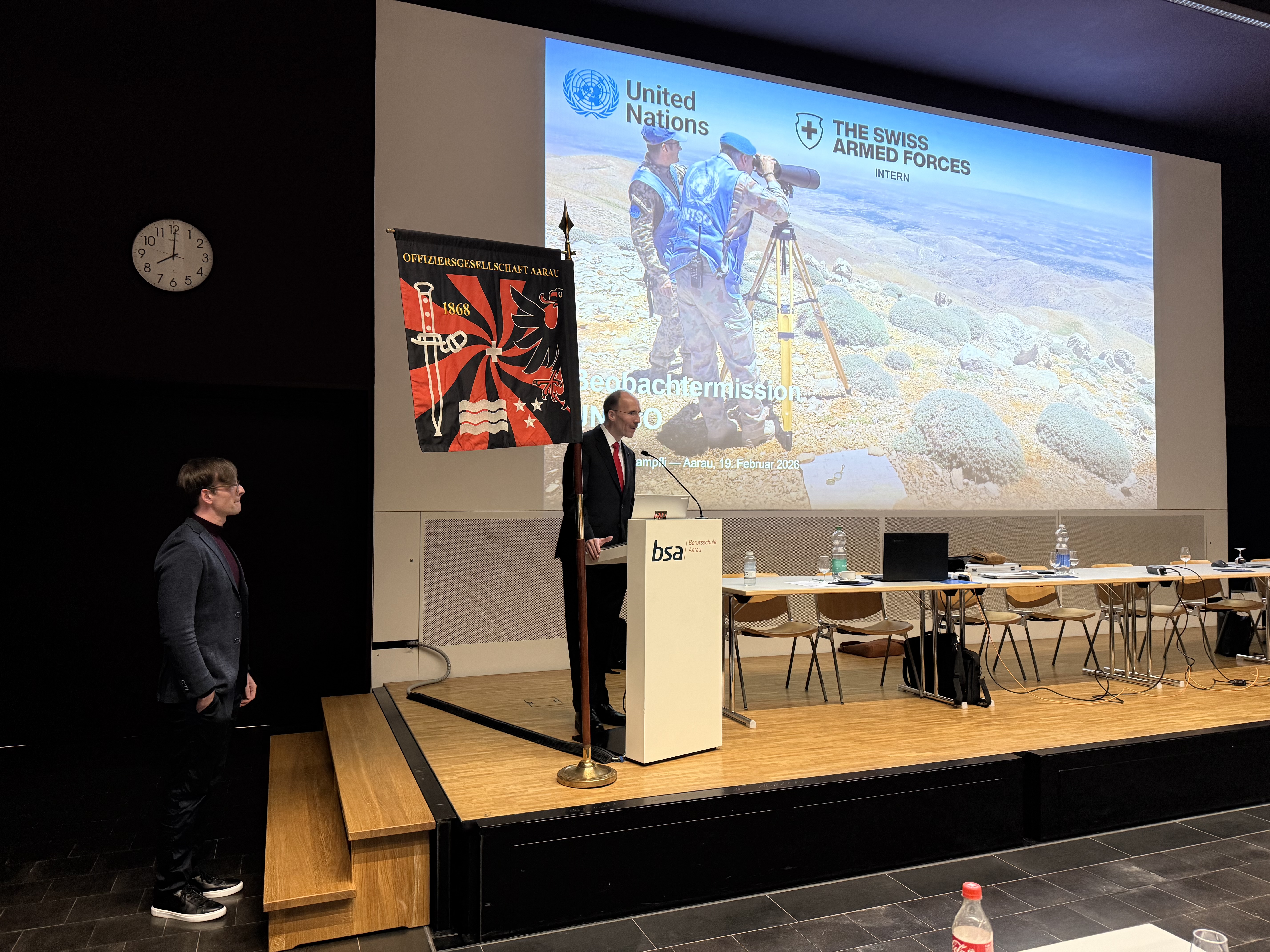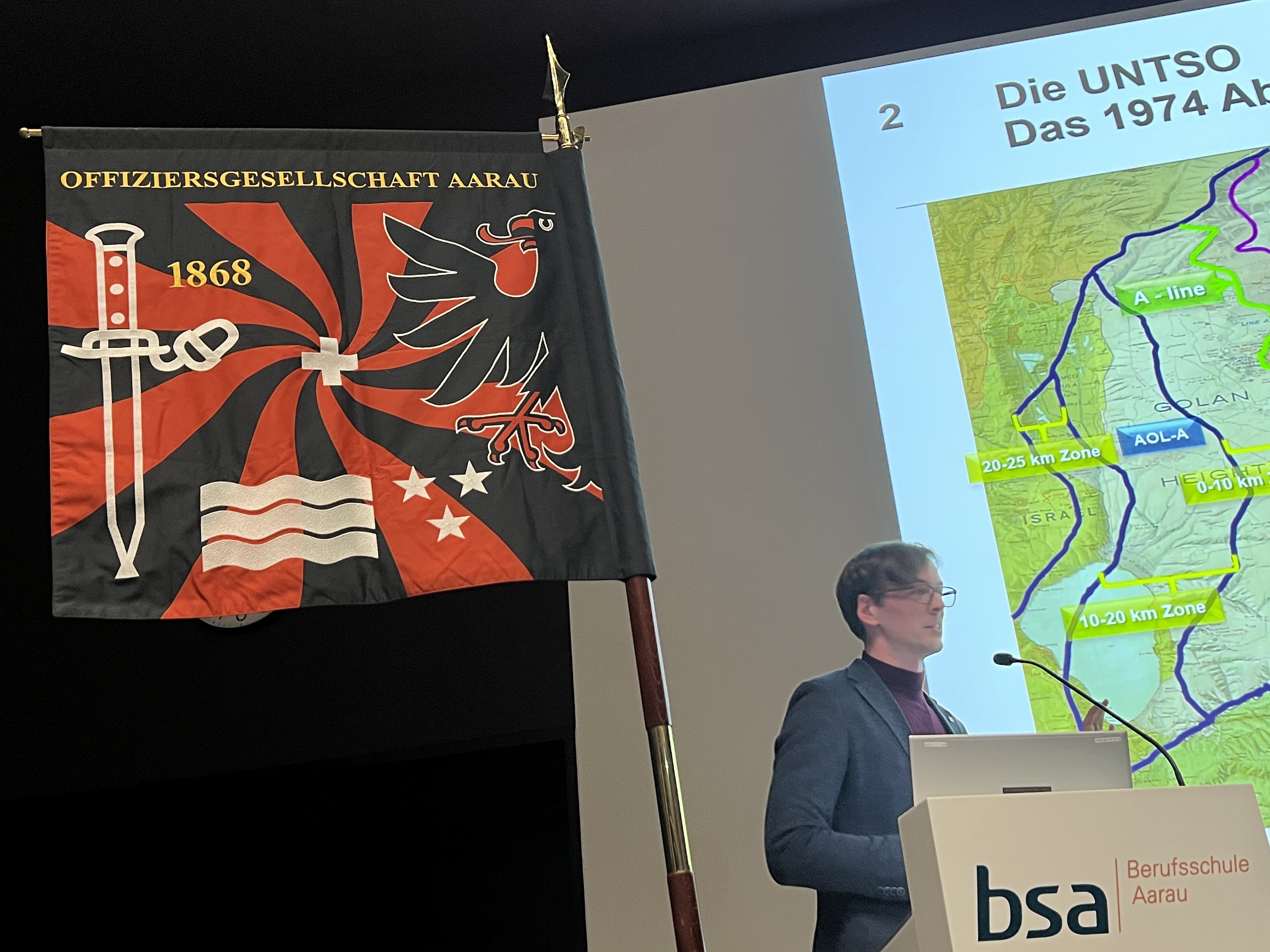 Im Anschluss folgte ein spannendes Referat vom ehemaligen Vorstandsmitglied Hptm Nils Stampfli, der von seinen eindrücklichen Erfahrungen aus dem einjährigen Einsatz als Beobachter in der UNO-Mission in Syrien berichtete.