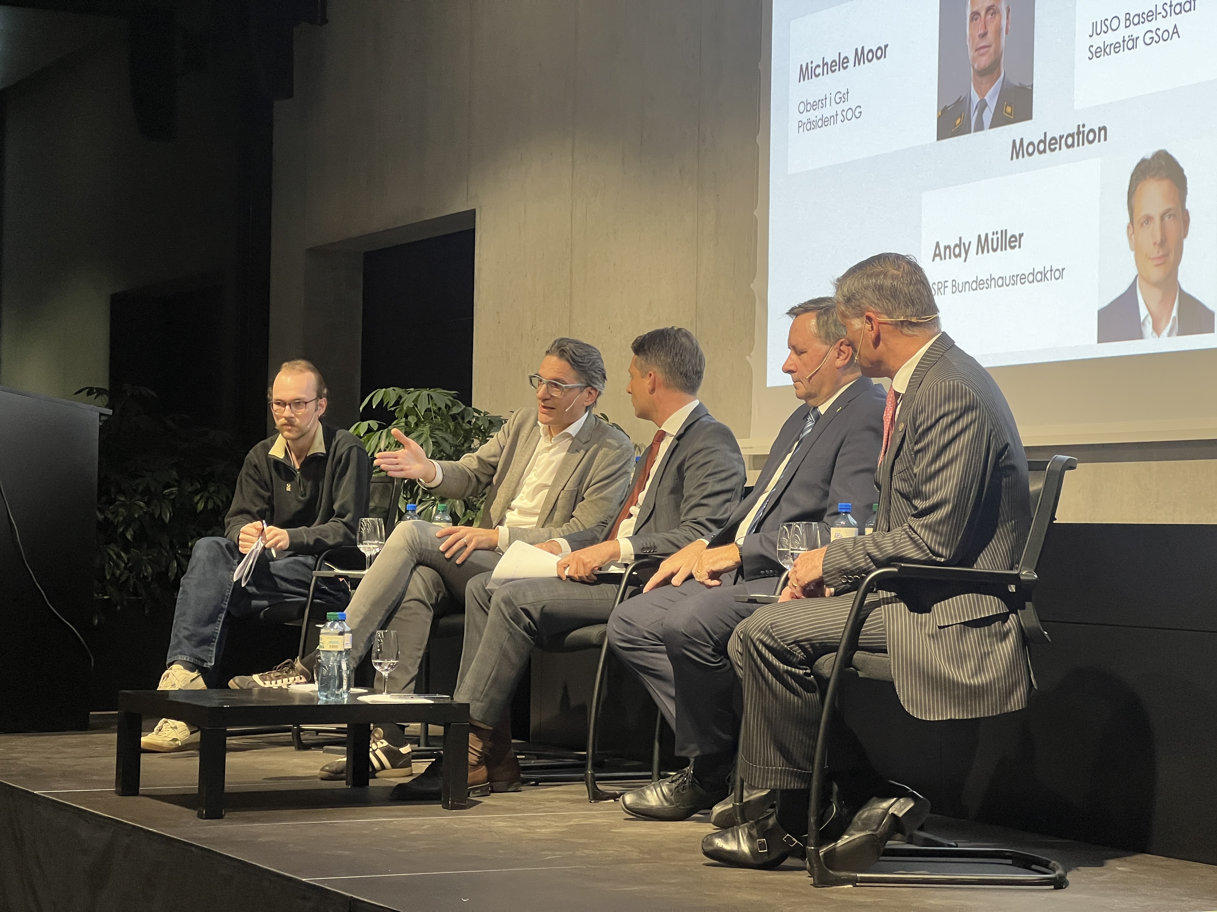 Den kleinsten gemeinsamen Nenner des Abends formulierte Nationalrat Andrey treffend: «Ich wünsche mir natürlich eine Welt, in der wir ohne Armeen auskommen und keine Kriege hätten – ich glaube, niemand hier drin wünscht sich im Endeffekt nicht auch eine solche Welt». Im weiteren Diskussionsverlauf wurde allerdings deutlich, dass Mittel und Wege, dieses Ziel zu erreichen, unterschiedlicher nicht sein könnten.
